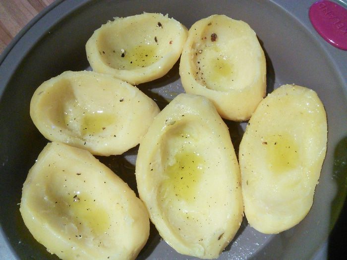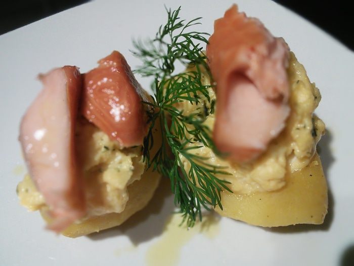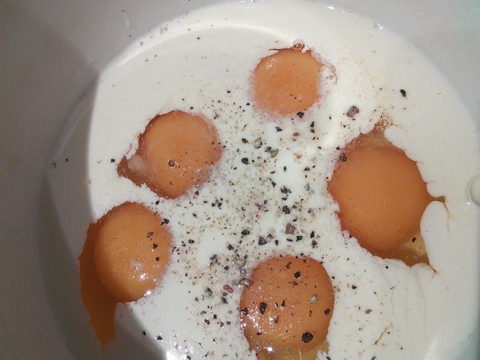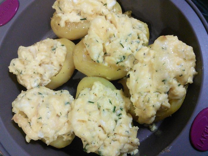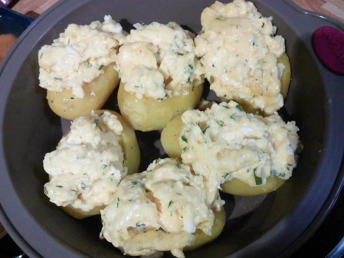 Для яичницы болтуньи смешать яйца, сливки, натёртый сыр с солью и перцем. На сковородке при постоянном помешивании пожарить болтунью (яичницу жарьте на среднем огне, постоянно подбирая её со дна сковороды, не давая ей пригореть), болтунья получается нежной и сочной. Так как она ещё будет запекаться в духовке, пусть она останется чуть влажной, притрусить болтунью рубленными укропом.
