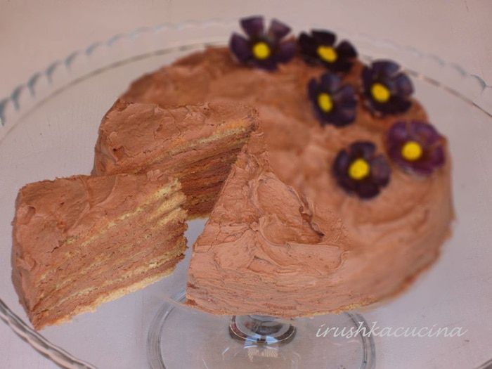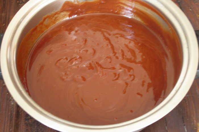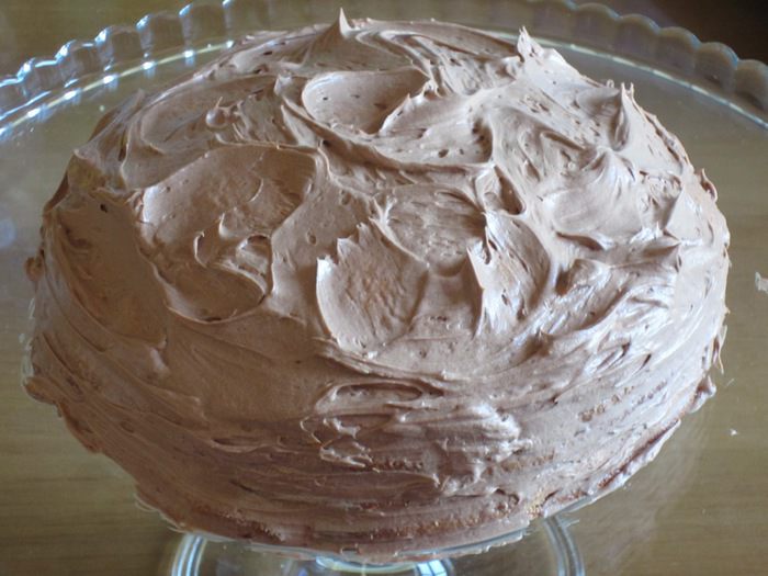 Коржи промазать шоколадным кремом. Часть крема нанести на поверхность торта. Поставить в холодильник на 3-4 часа.