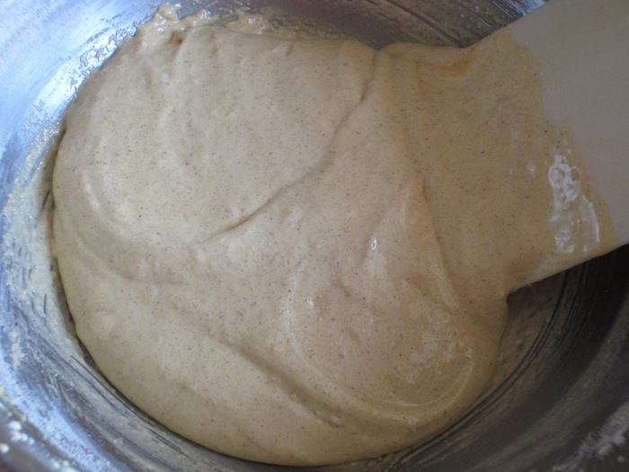 Ввести просеянную муку с разрыхлителем и тщательно перемешать.
