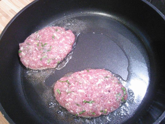 Сформируйте из фарша овальные, плоские котлеты (у меня довольно крупные, по одной на порцию) и обжарьте на масле с обеих сторон.
