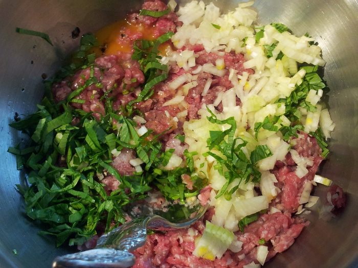 Мясо (мясной микс на ваш вкус, у меня говядина со свининой, можно заменить на фарш) порубите очень мелко, добавьте яйцо, зелень (тоже любую, у меня любисток), соль, перец и соду. Тщательно вымесите фарш. Я "кидаюсь" фаршем.