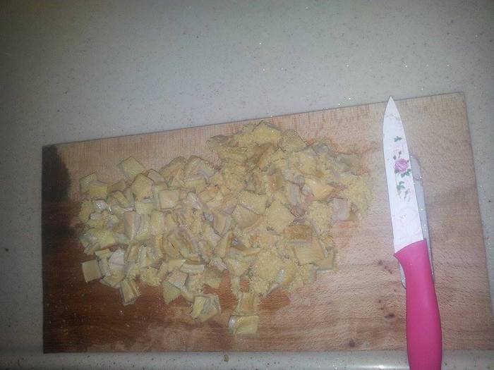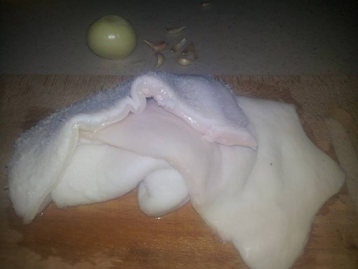Достаем его, даем немножко остыть. Ножом соскоблить с рубца верхний темный слой, зеленокоричневый. После промойте несколько раз, залейте большим количеством воды и оставьте в прохладном месте на сутки. Рубец станет белым, а запах частично пропадет. Говяжий рубец 500 гp.