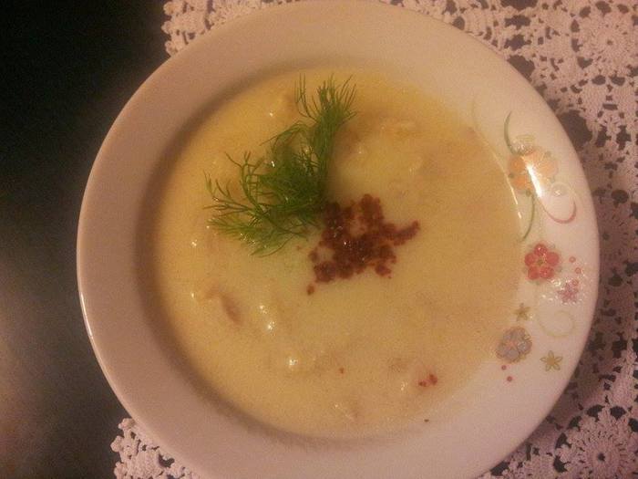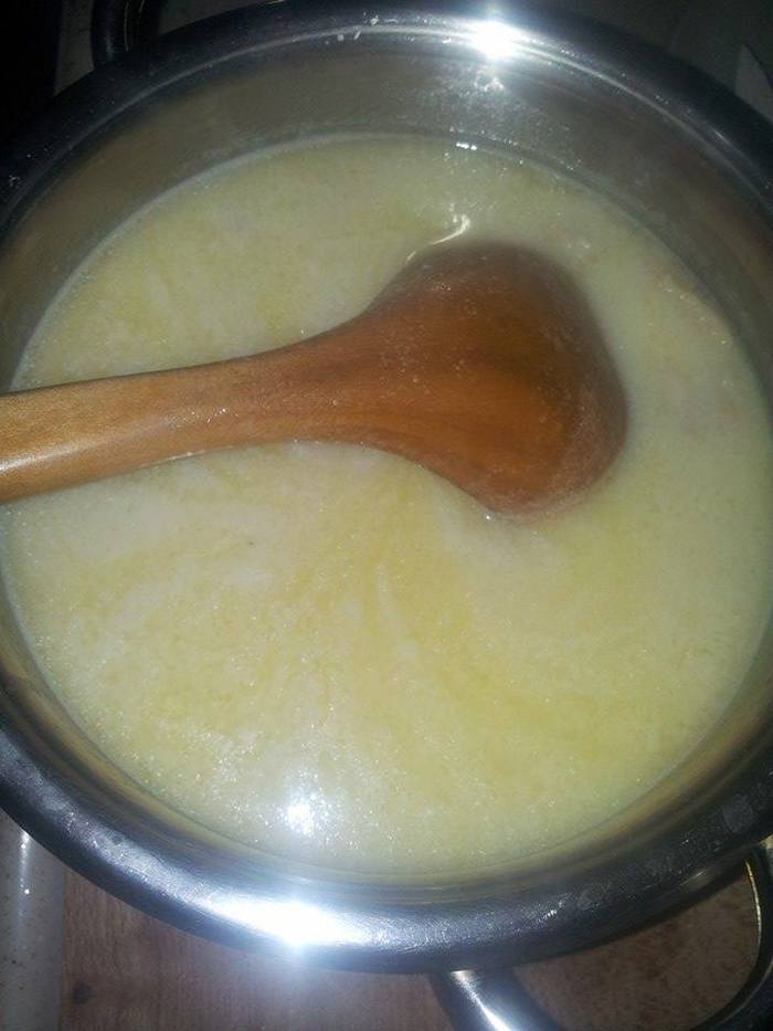 В кипящий бульон постепенно влить яичную смесь, непрерывно помешивая. Довести суп до кипения. Растопить сливочное масло, влить в суп.