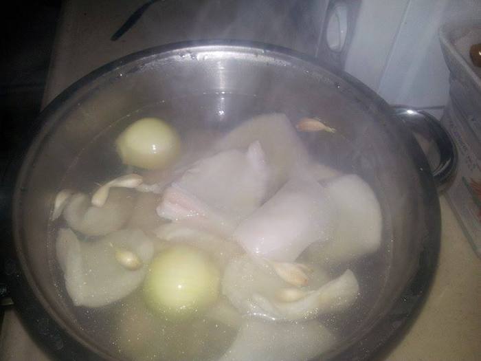 Положить рубец в кастрюлю, луковицу разрезанную пополам и чеснок (кожицу снимать не нужно). Залить 4 литрами кипятка, поставить на средний огонь. Вариться 3 часа. Рубец готов, когда легко протыкается вилкой.