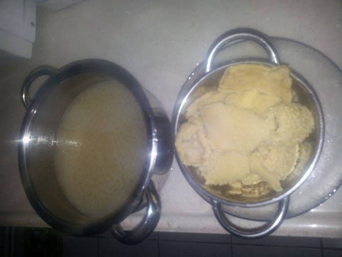 Порезать кусочками 1-2 см, положить обратно в бульон и поставить на огонь.