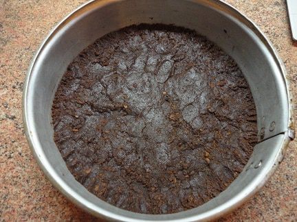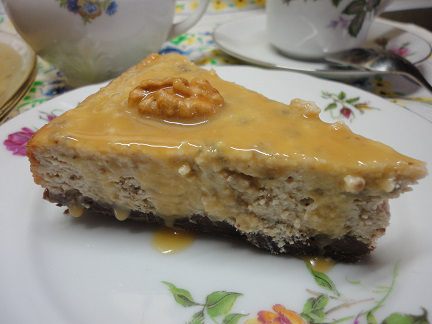 Приготовить карамельный соус. В сотейник с толстым дном положить сахар и нагревать помешивая, пока он не станет золотистого цвета, снять с огня. Сливки прогреть, не доводя до кипения, и тонкой струйкой вливать к сахару, постоянно помешивая. Если образовались кусочки леденцов, не переживайте, они растворятся. Теперь эту массу довести до кипения, добавить сливочное масло, хорошо перемешать и варить на медленном огне 5 минут. Охладить. Полить чизкейк, украсить его орехами и убрать в холодильник на 2 часа. У меня он стоял ночь. Когда убрала края разъемной формы, соус красиво разлился по блюду. Вот такой он в разрезе.