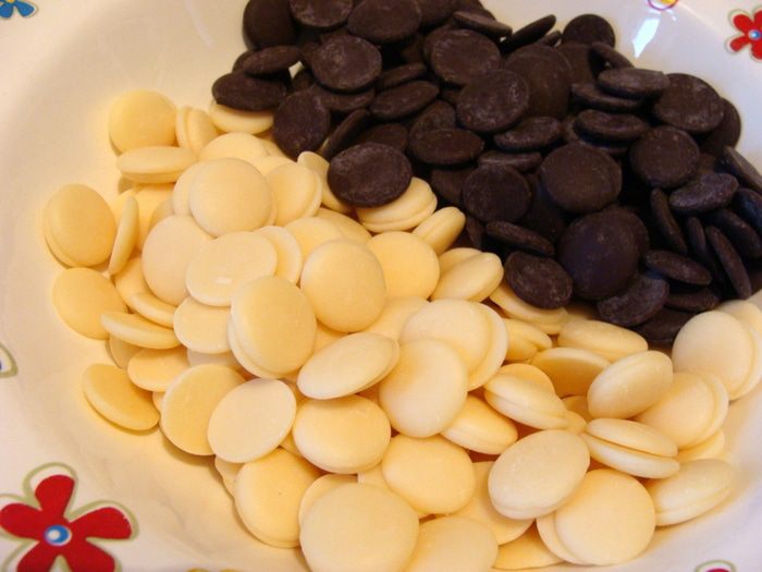 Добавить шоколадные капли, у меня из белого и черного шоколада.