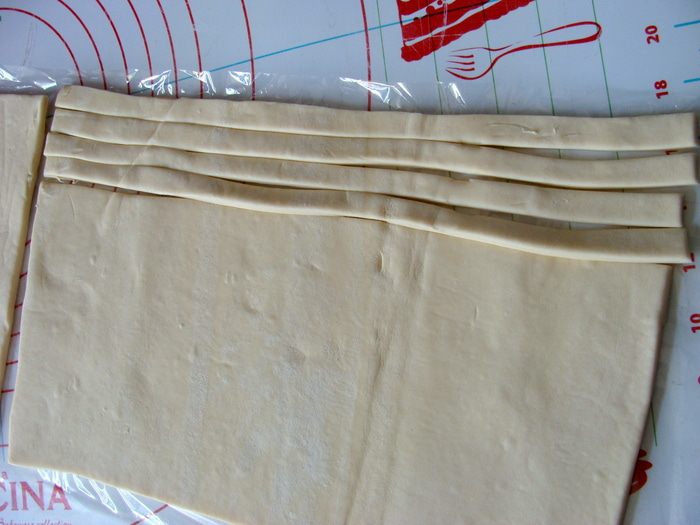 Потом слоями выкладывать полоски теста и обильно смазывать кремом.