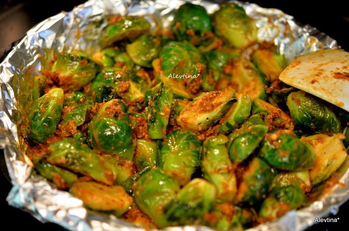 Смешать с брюссельской капустой готовое песто. Я поставила на несколько минут в горячую выключенную духовку.