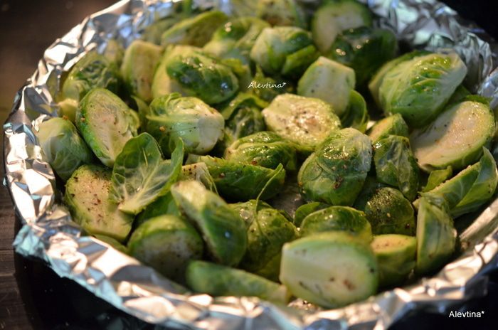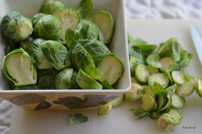 Разогреть духовку на 200 гр. Капусту брюссельскую очистить и порезать на половинки.
