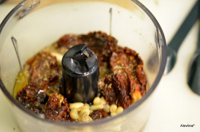 Кедровые орешки слегка поджарить. В кухонный процессор налить воды и оливковое масло, добавить вяленые томаты (желательно без масла, сухие), чеснок, кедровые орехи, уксус, орегано, пармезан. Все вместе измельчить.