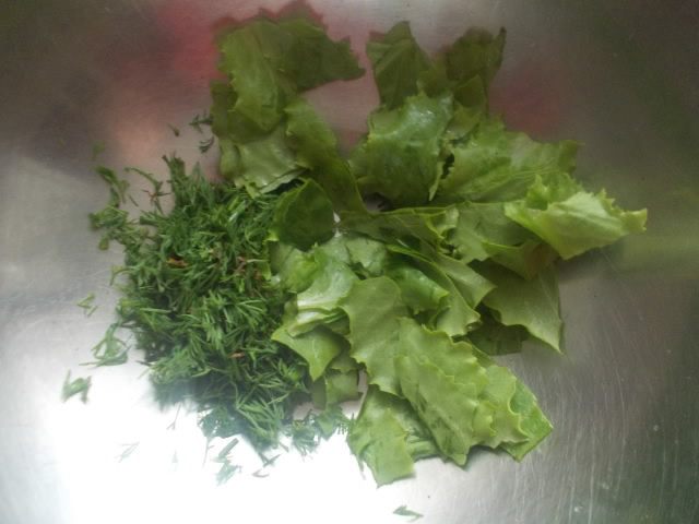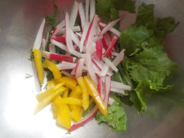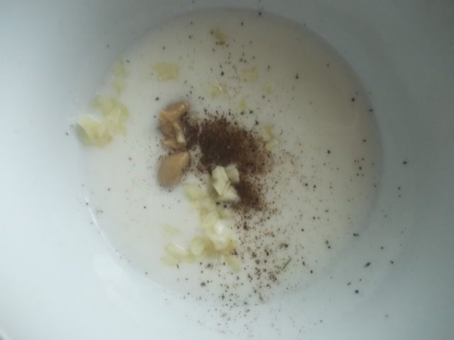 Приготовить заправку. Кефир смешать с чесноком, капелькой горчицы, перцем и солью.