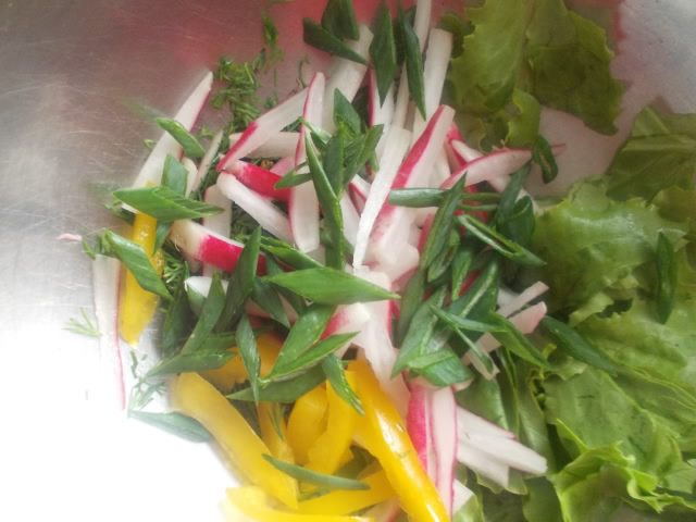 Зеленый лук порезать наискось, чтобы получились перышки.