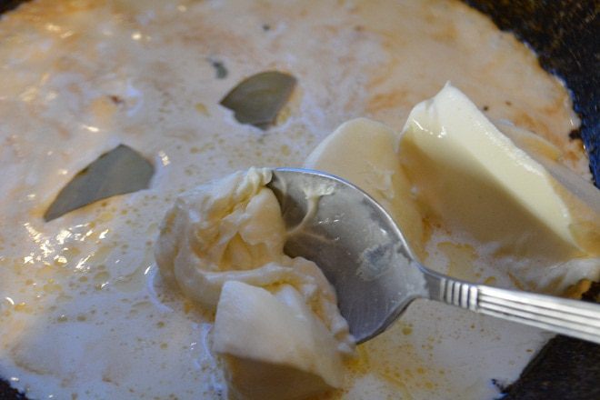 В сковороду, в которой жарились котлеты, вылить 100 г сливок ,добавить плавленный сыр и лавровый лист с мускатным орехом. Поставить на медленный огонь и помешивать до растворения сыра.