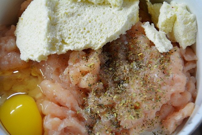 Куриную грудку освободить от костей и кожи и прокрутить на мясорубке. Булочку замочить в сливках, отжать и добавить к фаршу. Туда же добавить яйцо, прованские травы, перец и соль. Вымесить однородный фарш.