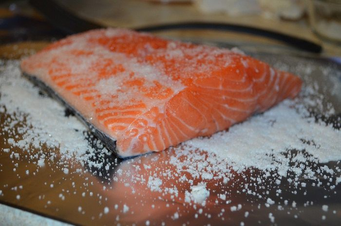 Смешать сахар и соль в пропорции 2:1. Две части соли и одна сахара. Посолить хорошенько семгу со всех сторон (пересолить не бойтесь, рыба возьмет соли столько, сколько ей надо).