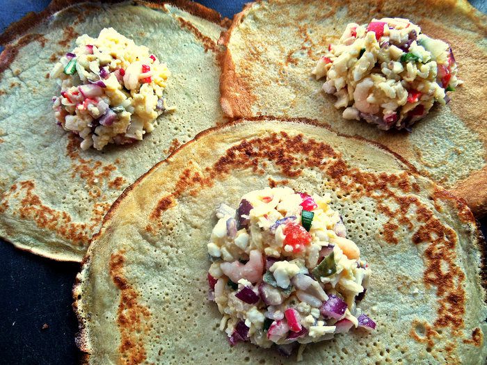 Получаются эластичные блины с тонким хрустящим краешком,я придумала такую начинку к ним и оформила "мешочками"!