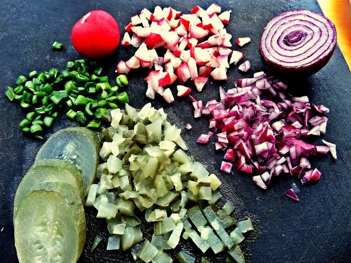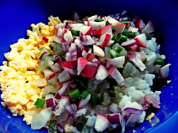 Для начинки мелко порубить, лук, огурчик, редиску.