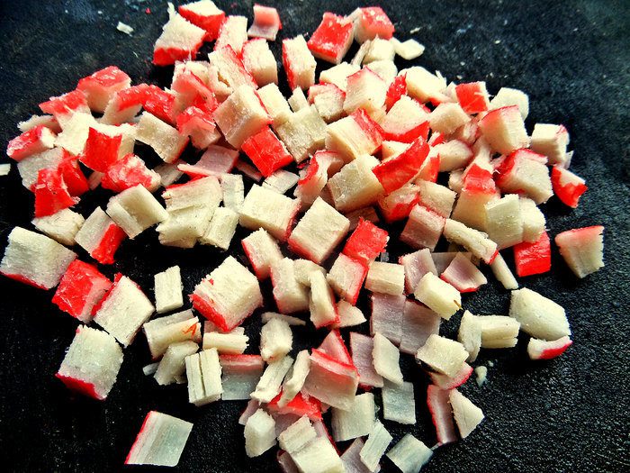 Крабовые палочки можно не размораживать, сразу нарезать.