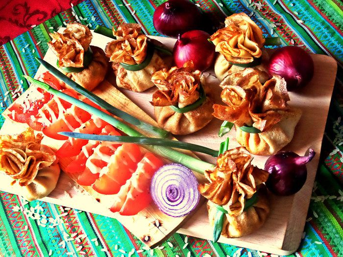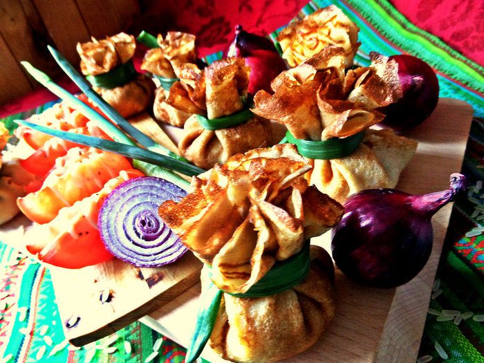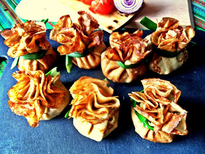 Так как блинки маленькие,"мешочки" получаются на 2 укуса, а завязывание луковой стрелой вместо бантика требует кропотливости и ювелирности во всём.