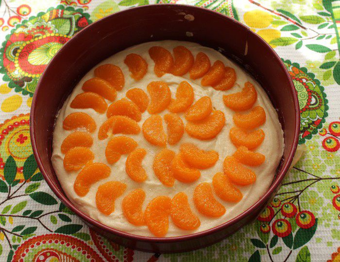 Тесто вылейте в форму 24см. Выложите сверху мандариновые дольки. Посыпьте 1 ст.л сахара.