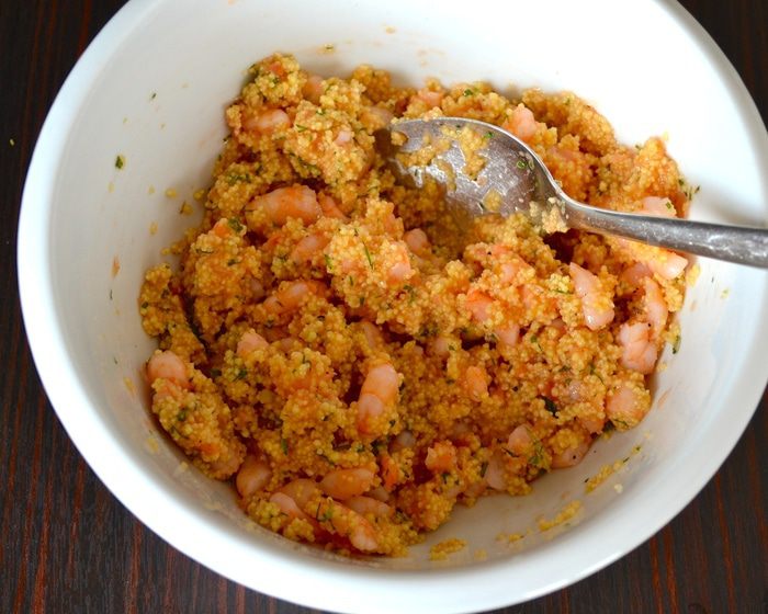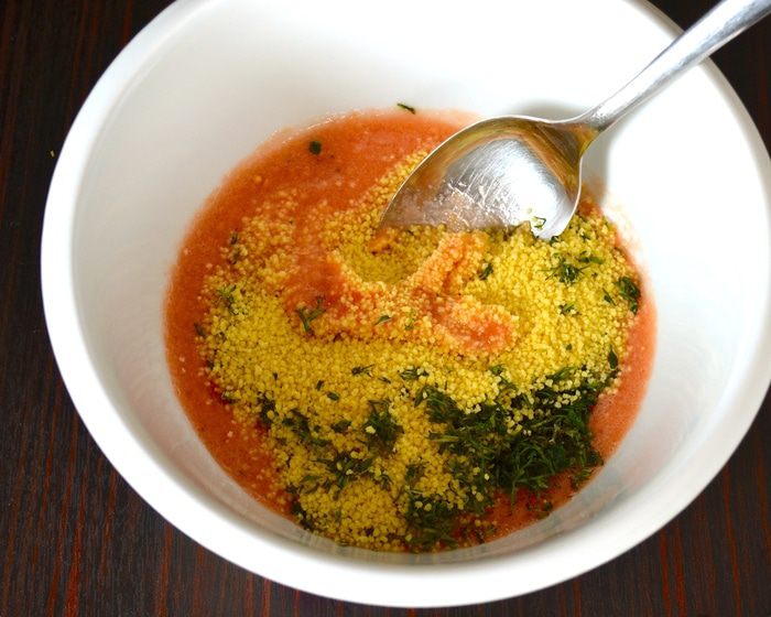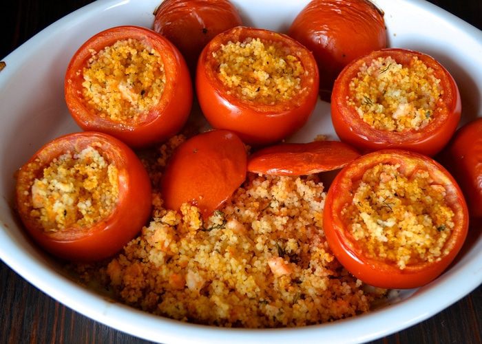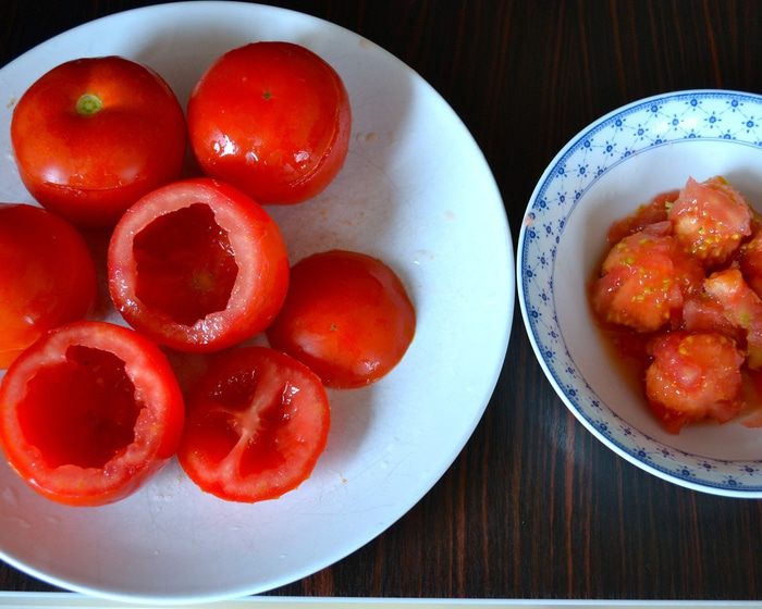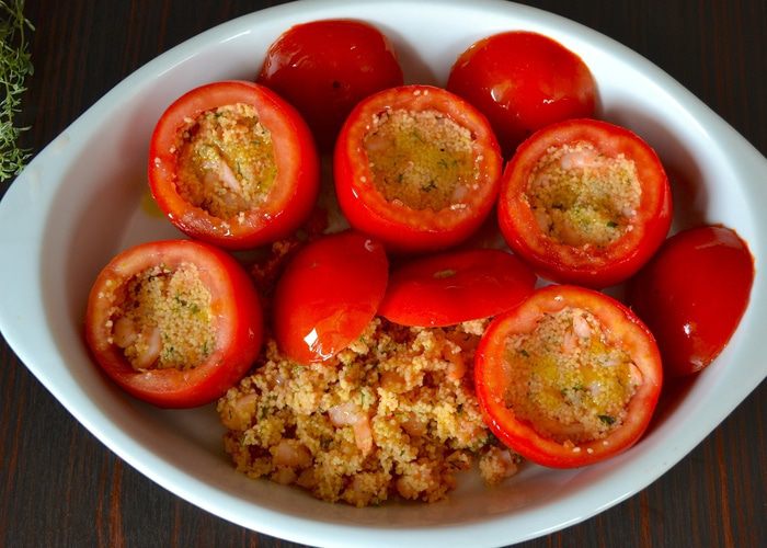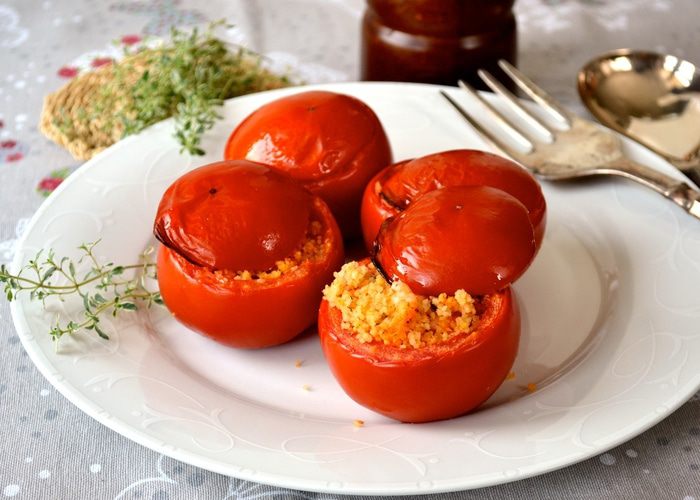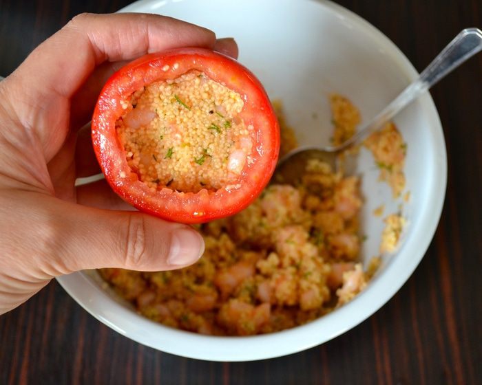 Рецепт рассчитан на 5 помидоров, весом 750 г. Помидоры вымыть и срезать у них верхушку. Извлечь осторожно всю мякоть из помидоров. А получившиеся "коробочки" перевернуть, чтобы стекла лишняя жидкость. Мякоть отделить от семян и измельчить с помощью блендера. Взвесить количество измельченной помидорной мякоти. И отмерить равное ее весу количество кускуса! У меня получилось 90 г томатного пюре, поэтому в ингредиентах указано 90 г кускуса.