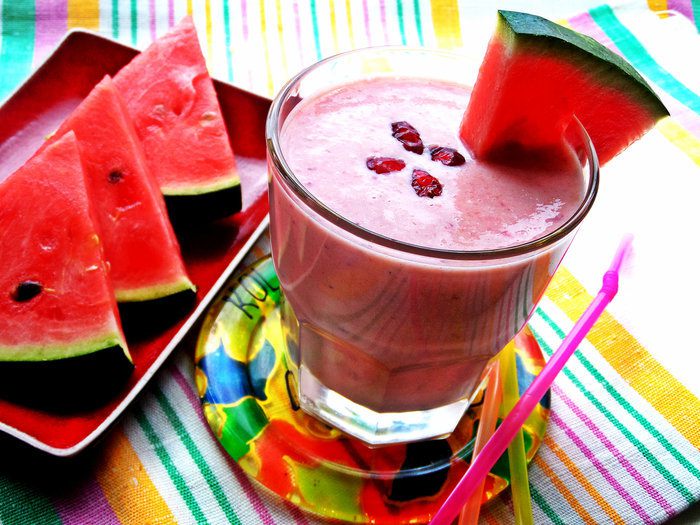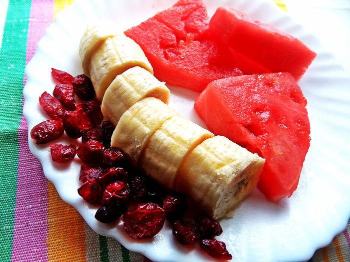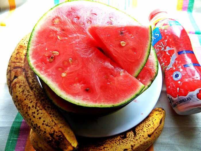 Арбузы, конечно, привезены издалека, но все спелые, красные. Бананы лучше переспелые, с точечками на кожуре - так нежнее будет.