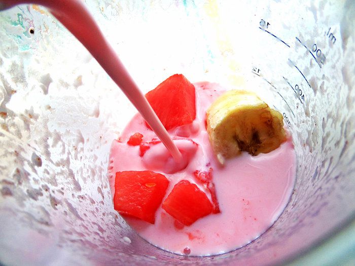 Закладываем кусочки в ёмкость для блендера, заливаем питьевым йогуртом (у меня клубничный, но можно просто кефир).
