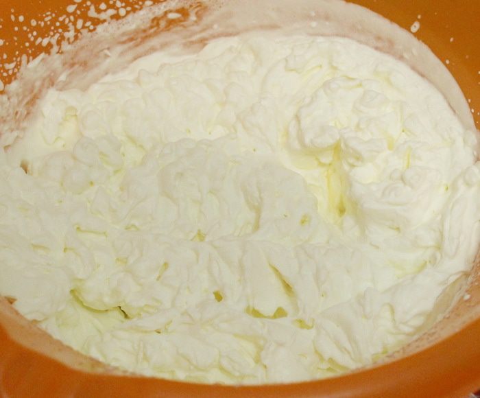Сливки взбить в плотную пену, смешать с творожным кремом и желатином.