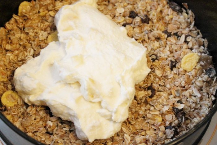 На основу из мюсли выложить творожный крем и поставить в холодильник на 2-3 часа.