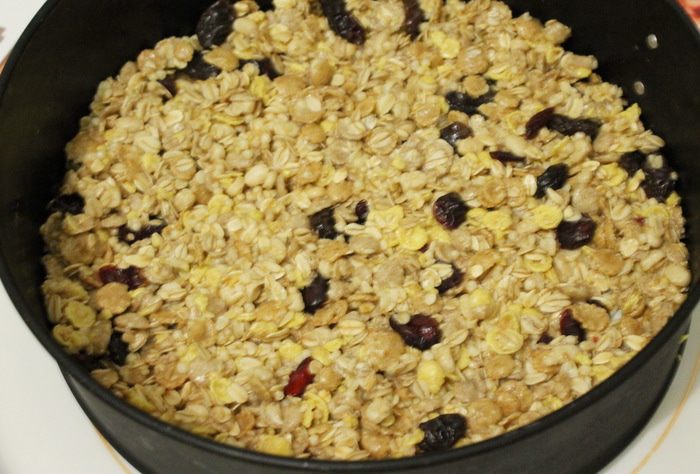 Распределить полученную смесь по дну формы, выстеленную бумагой для запекания или фольгой. Поставить охлаждаться (можно и в холодильник).