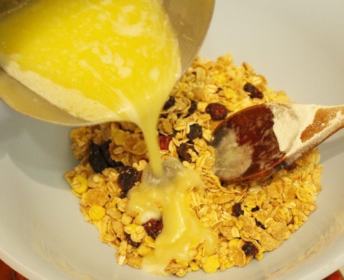 Смешать мюсли с растопленным сливочным маслом и 50 грамм сахарной пудры.