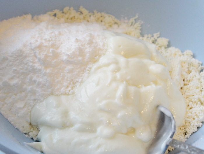 Творог протереть через сито. Добавить к нему рикотту, йогурт, оставшуюся сахарную пудру, сок и цедру лимона. Перемешать.