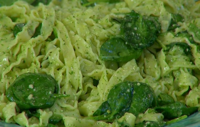Заправить фестонате соусом песто, перемешать, добавить шпинат, влить немного воды, в которой макароны варились, и еще раз все перемешать.