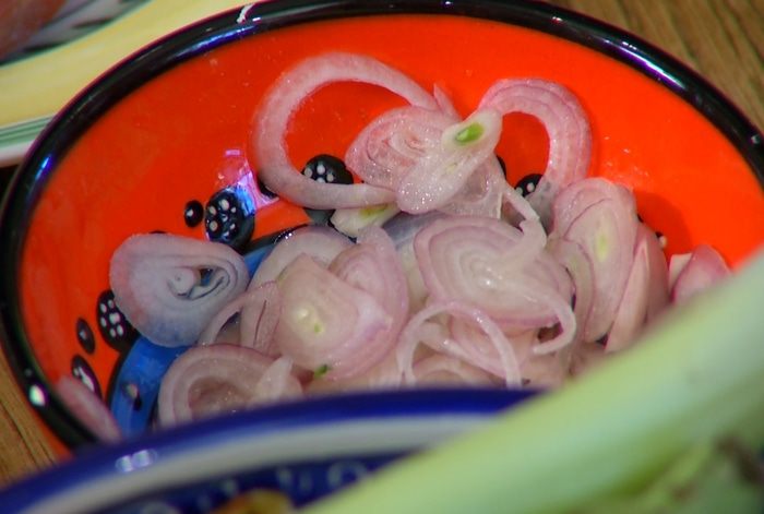 Шалот почистить и нарезать тонкими кольцами, затем залить лук уксусом и дать ему замариноваться.