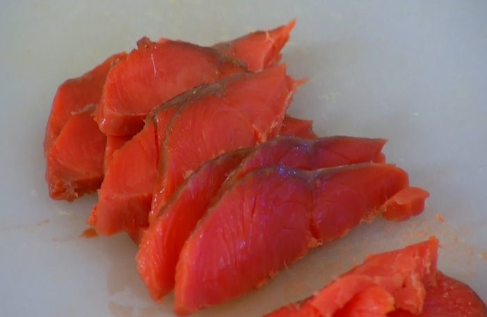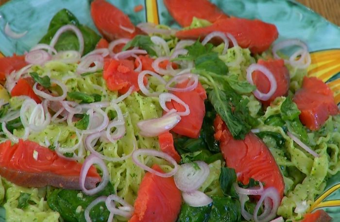 Выложить пасту на большое блюдо, сбрызнуть оливковым маслом, сверху поместить ломтики рыбы и замаринованный лук.