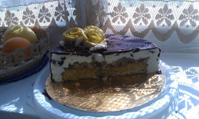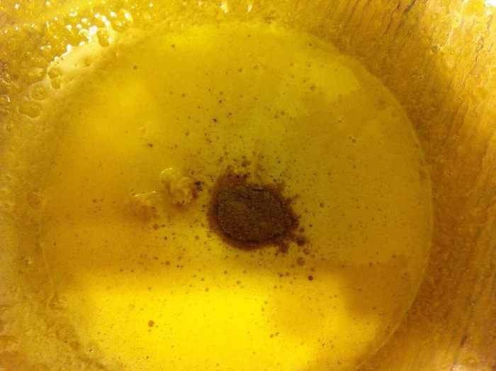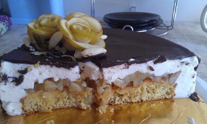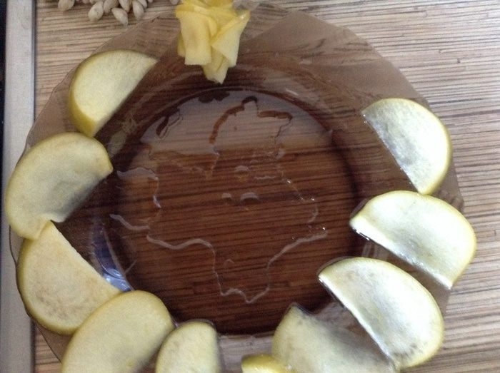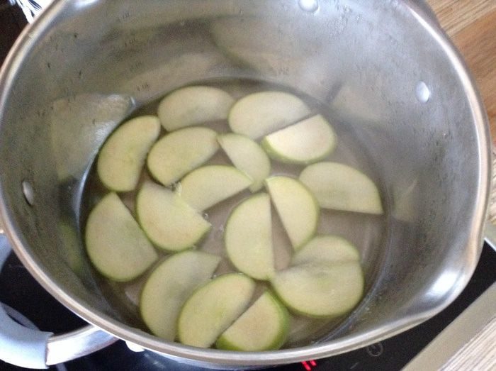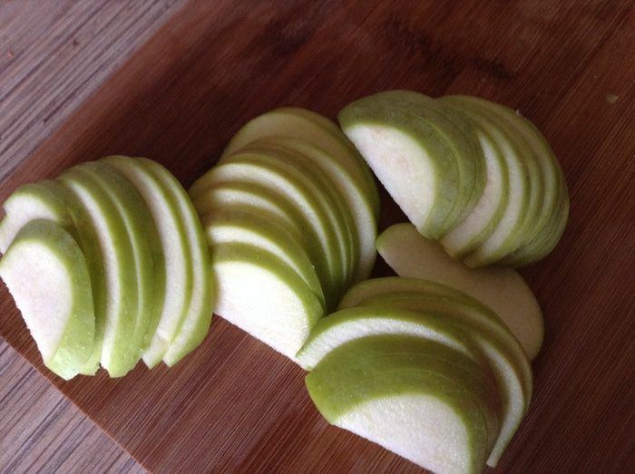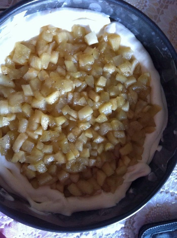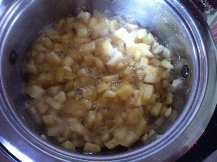 Яблоки нарезать кубиком сбрызнуты лимонным соком что бы не потемнели, на греть в сотейнике 3 ложки меда, добавить яблоки, тушить 10 минут в конце добавить щепотку корицы, если Ваши яблоки очень кислые можно добавить 1 ст. л. сахара. Откинуть на дуршлаг, жидкость собрать, дать остыть.