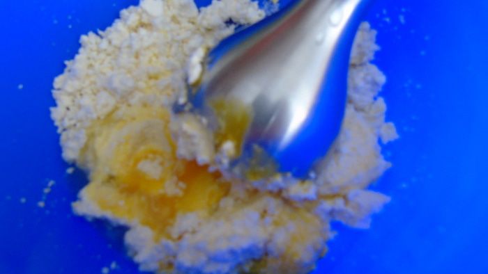 Взбить творог с яйцами и ванилином.