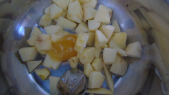 Яблоки очистить, мелко нарезать, добавить мед и томить на медленном огне до размягчения.