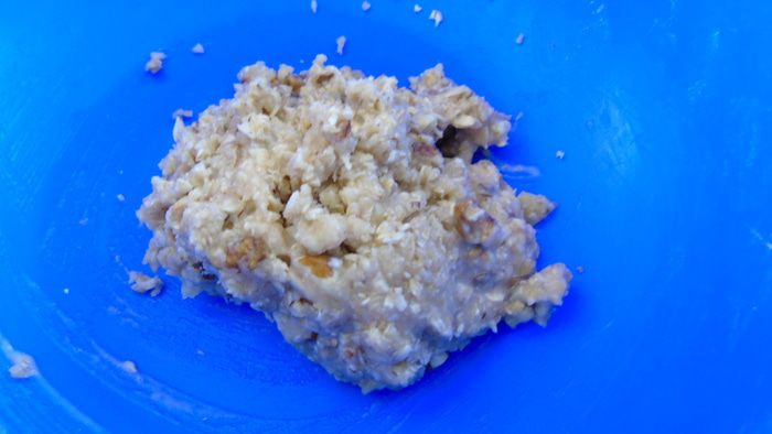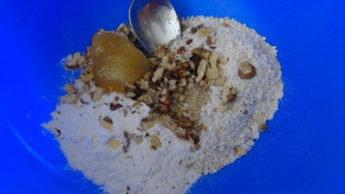 Овсяные хлопья измельчить в муку, соединить с обычной мукой, медом, орехами, любые, я добавила грецкие.