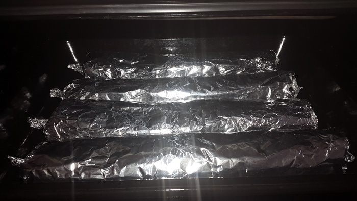 Повторяем эту процедуру с остальными ингредиентами. Упаковываем лаваш в фольгу, выкладываем на противень и запекаем при температуре 180-200 С -15 минут.