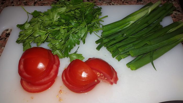 Лук режем на три части, у петрушки удаляем жесткие стебли, помидор режем дольками.