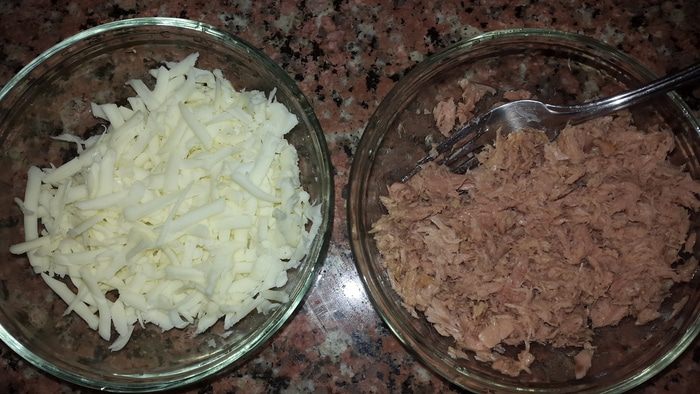 С тунца сливаем жидкость и разминаем вилкой, сыр трем на крупной терке.