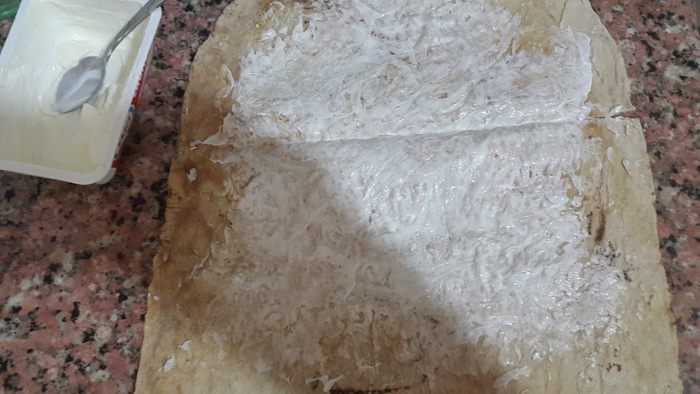 Лаваш разрезаем на две части и тонким слоем смазываем мягким сыром не захватывая края. У меня был сыр лабне.