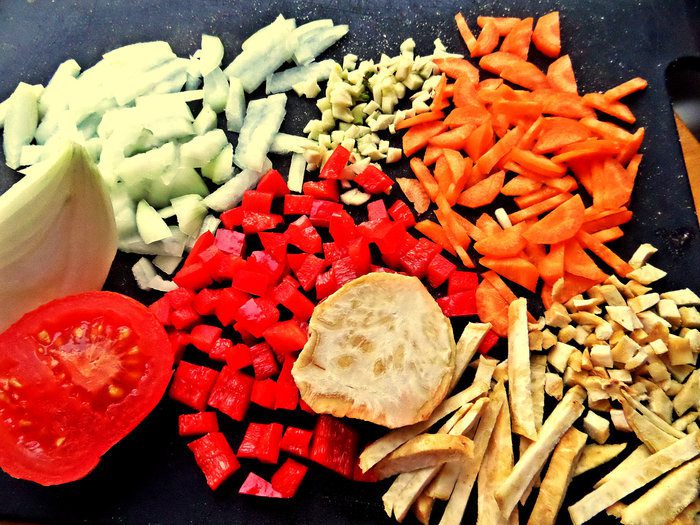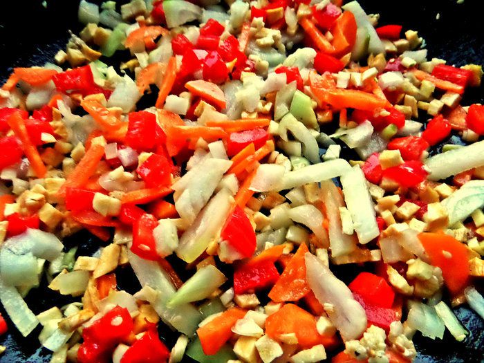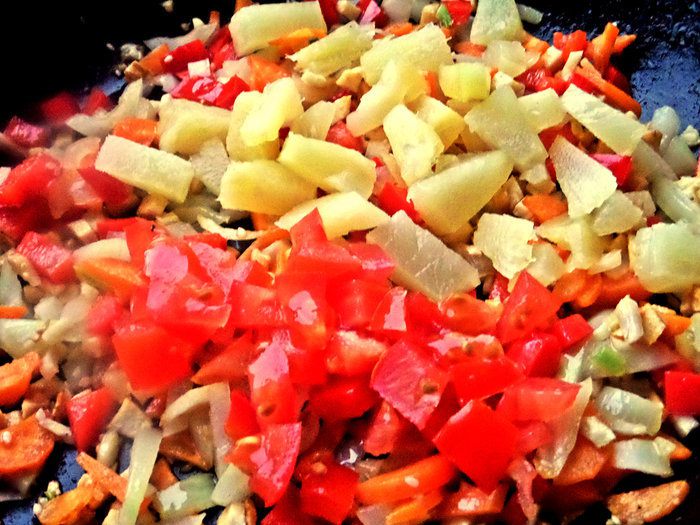 А в сковороду после курицы высыпать овощи (пока без помидора).