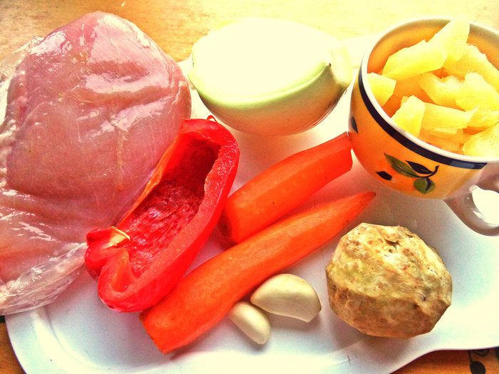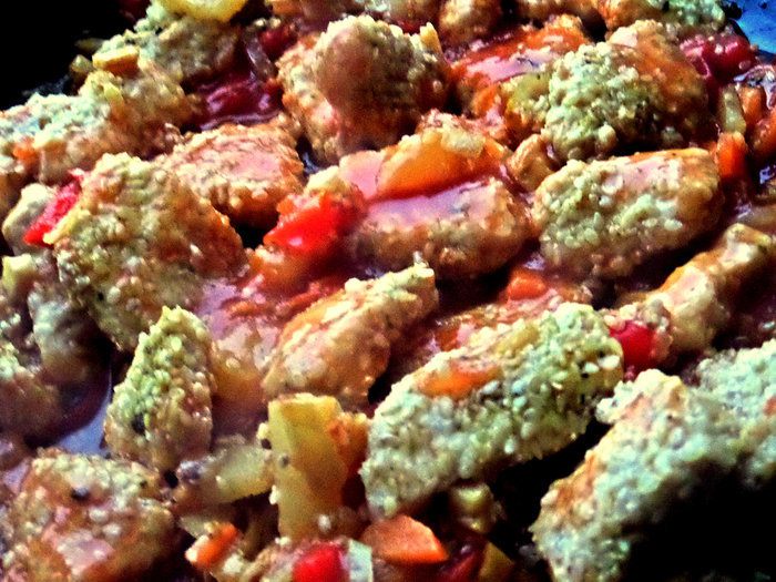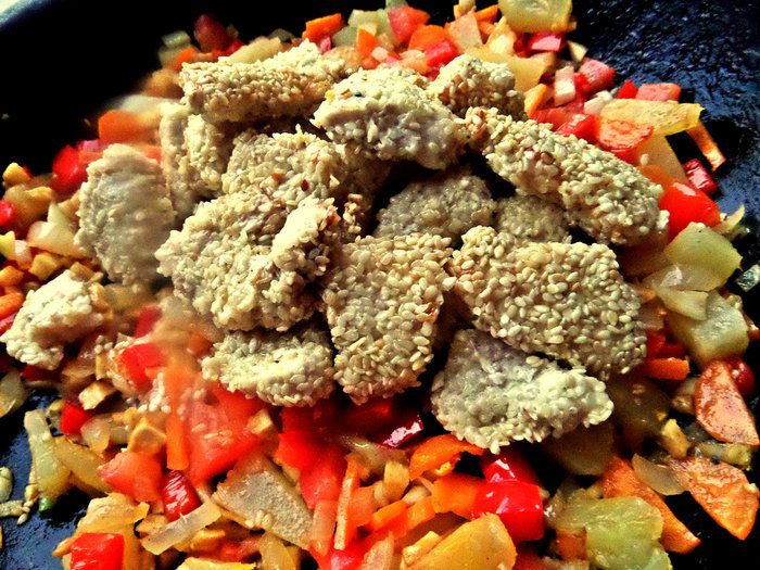 Курицу с рисом все знают и приветствуют в каждой семье! Из филе можно приготовить быстрый ужин. Добавим для сочности ананас и "старые" добрые коренья, которые не прибавят калорий блюду... Самый калорийный здесь кунжут -панировка вместо муки