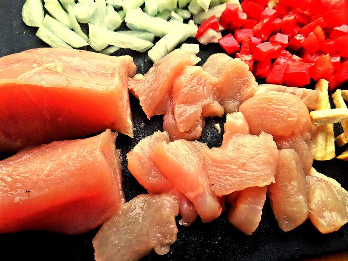 Куриное филе обсушим и нарежем на удобные кусочки.