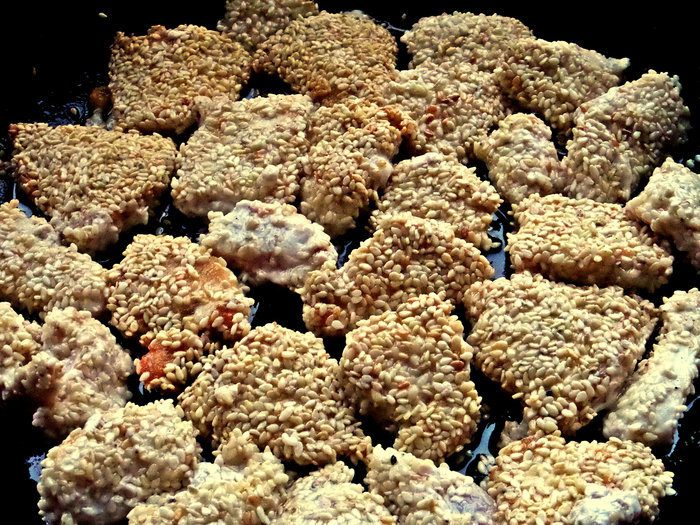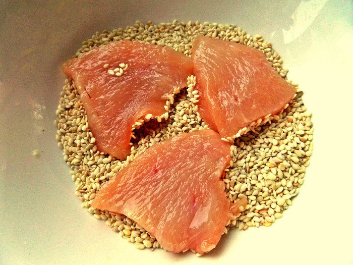 Насыпать кунжут в пиалу и обвалять в нём куриные кусочки.