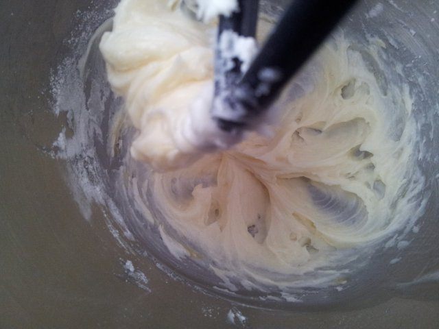 120 грамм мягкого масла и сахарной пудры взбить несколько минут миксером на небольшой скорости до кремообразной массы.