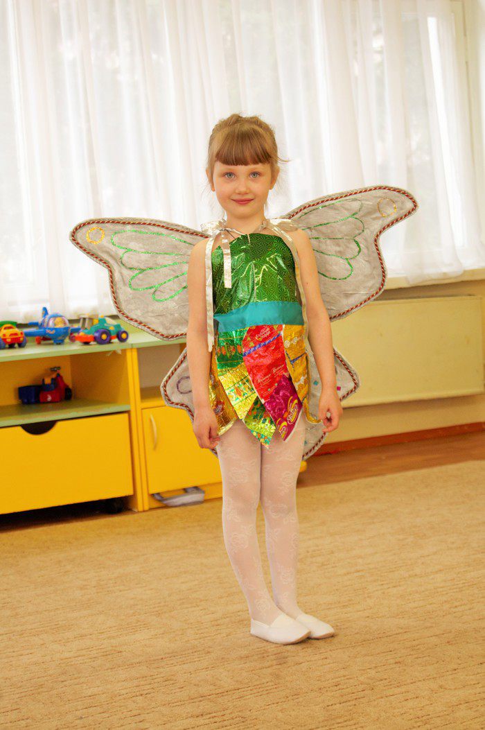 На прошлой неделе моя пятилетняя дочка принимала участие в детсадовском конкурсе. Нужно было пошить костюм из конфетных фантиков. Причем поэтапно запечатлить на фото весь процесс! Я была однй из 4-х мамочек, которая на это подписалась. Когда муж узнал, он очень долго смеялся. Я объясню почему: я хорошая жена, слежу за порядком в доме, вкусно кормлю, мой муж каждый день одевает чистую отглаженную рубашку, я вымываю окна в квартире 5 раз в год, да чего уж там... я даже картошку умею сажать! В общем, я классная!) Но я никогда и ничего не зашиваю и не пришиваю. Это наследственное. От мамочки. Для нас с ней пришить пуговку - это что-то невообразимое. Детские колготки - это отдельная история: появляется маленькая дырочка и я точно знаю, что моя доченька не подведет и расковыряет эту дырочку до настоящей дырыщи! Ну а как её потом зашивать? Никак! Проще новые колготки купить) Вот. А тут - целый костюм! Но я справилась. И видя, как неиспово я шила платье своими белыми ручками - муж подключился к процессу и сделал из проволоки и моей белой фоновой тряпочки прелесные крылышки) Я их потом покрасила и оклеила бусинками и специальными цветными посыпками. И наша Кира была Конфетной Феей) Фото прилагается. А еще под это дело мы с Кирой выучили презабавнейшее стихотвореньице. Рекомендую для изучения).